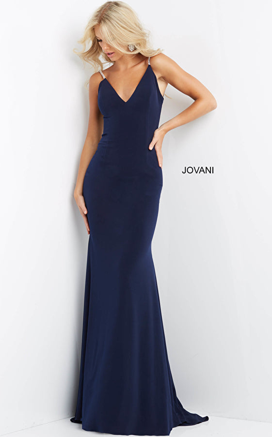 The Jovani 07297 is a statement dress for formal events. It features a spaghetti strap and a daring open back, both adorned with sparkling rhinestone embellishments. Versatile and elegant, this dress is sure to make you stand out.