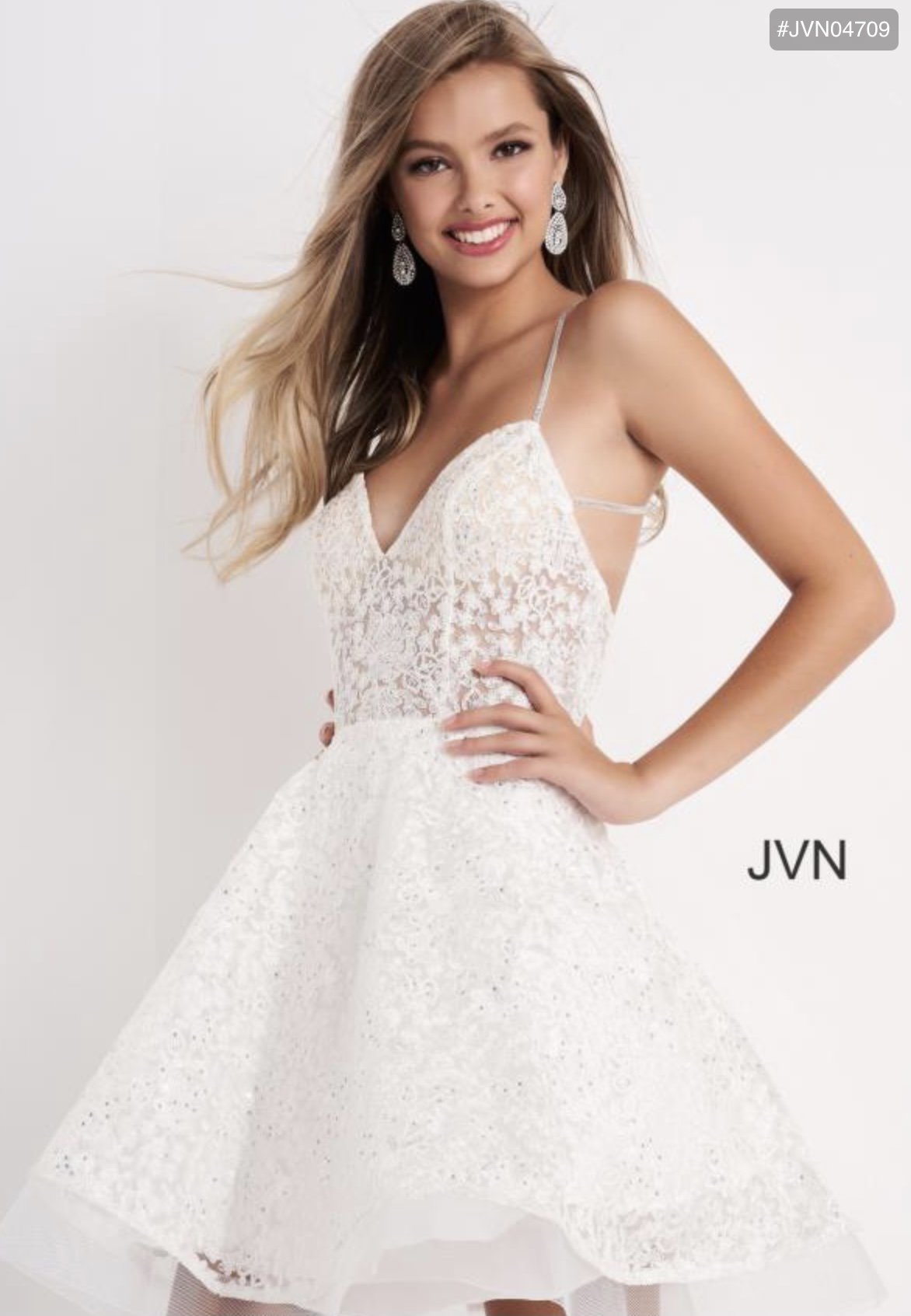 Look stunningly beautiful in this short formal gown with a fit and flare silhouette and open back. Delicate lace and glittering rhinestones add extra sparkle to your special event! Be confident and show off your sense of style in the Jovani JVN04709.