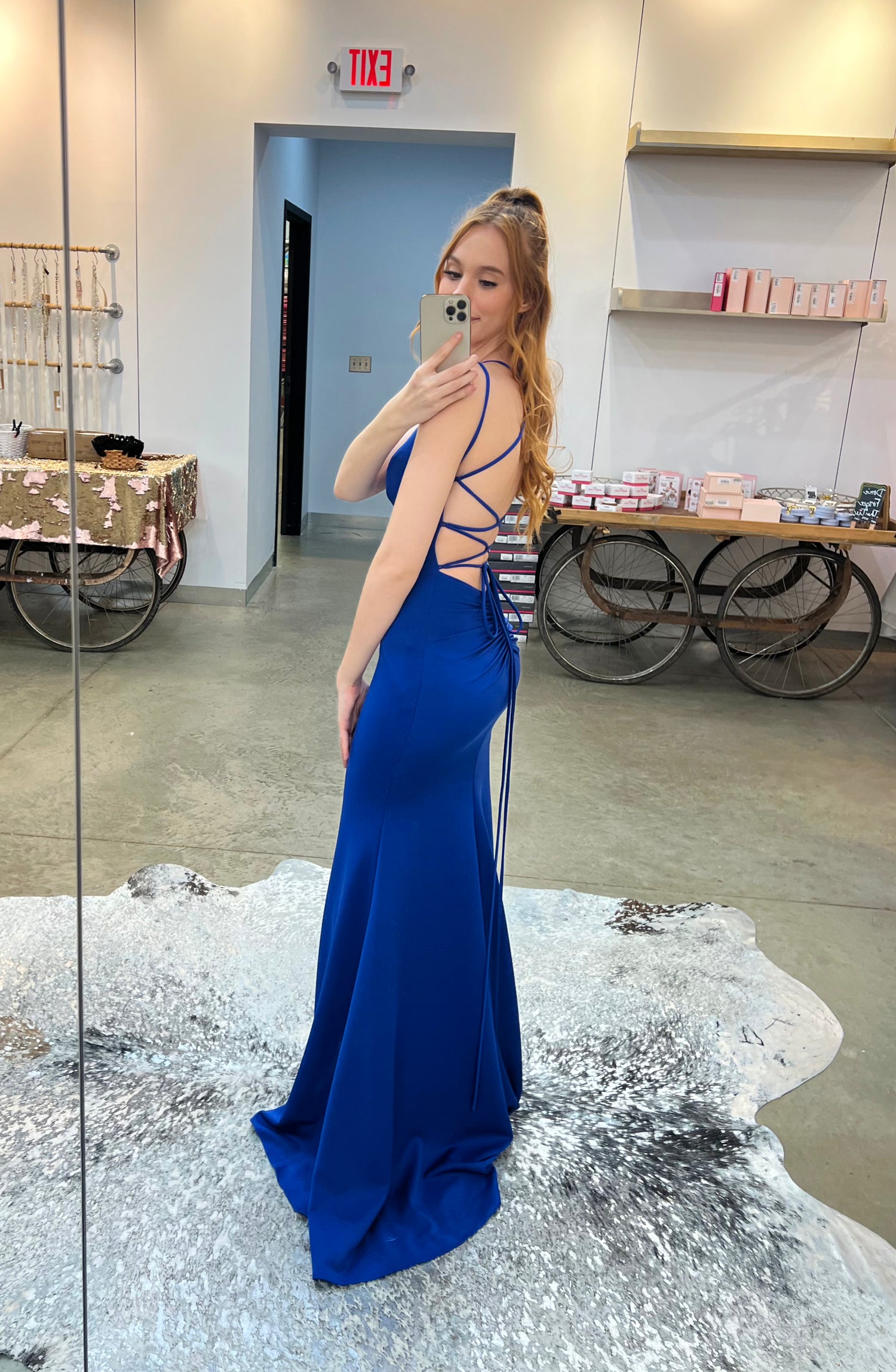 This JVN by Jovani JVN07402 formal gown features a fit and flare silhouette with a shallow V-neckline and doubled straps that lace-up at the open back. A thigh-high slit accents this pretty prom dress, finished with a ruched derriere and a sweep train.