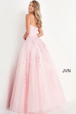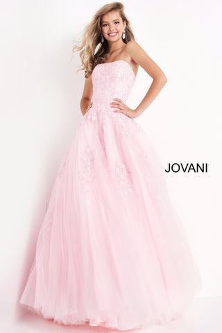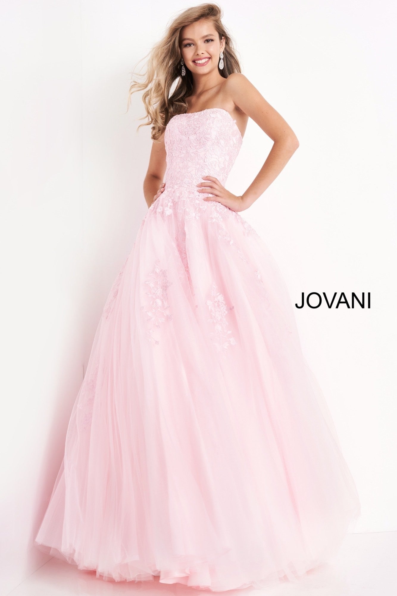 Indulge in the effortless elegance of the Jovani JVN1831 gown. Its A-line silhouette, delicately embroidered tulle, and solid lining create a stunning contrast. The curved strapless neckline enhances your natural curves, while the drop waist and gathered ballgown skirt add a touch of whimsy. A masterpiece of sophistication and style.