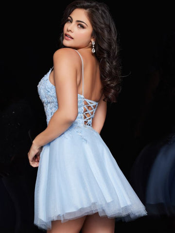 Feel exquisite in JVN by Jovani JVN22329! This light blue cocktail dress, shimmering with glitter tulle, features a sweetheart neckline, spaghetti straps, and a laced-up semi-open back. The bodice and top skirt are further embellished with sophisticated beaded embroidery, creating a look that will have you feeling unforgettable!