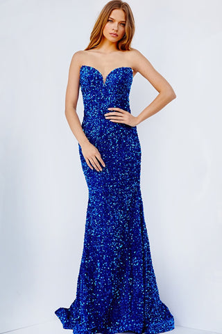 Look stunning at prom in this royal blue Jovani Sheath Sequin Prom Dress. Floor-length sequins shimmer and shine, while a form-fitting silhouette and plunging neckline make sure all eyes are on you. With its lovely strapless bodice and straight back, you'll be ready for the night of your dreams!