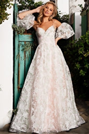 Be the life of the party in this ballroom ready JVN37531 gown from Jovani! The dreamy floral pattern and detachable puff-sleeves add the perfect amount of detail while the flowy A-line silhouette will keep you dancing the night away. Now all you need is a crown!