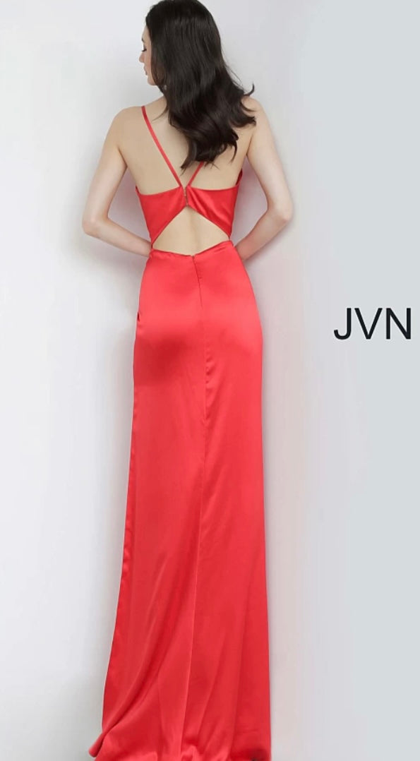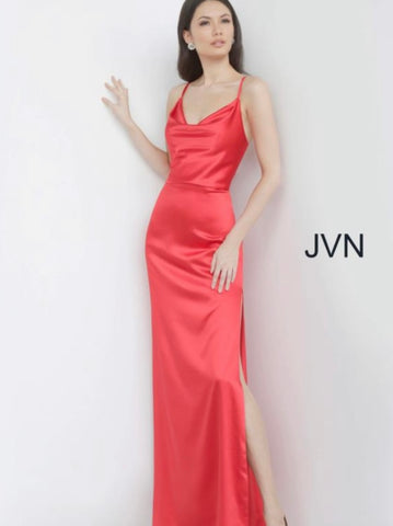 JVN4390 Red Fulfill your prom style dreams in this exquisite Jovani JVN4390 dress! Cut from gorgeous satin fabric, this chic gown features a cowl neckline, side slit, and open back for a timelessly glamorous silhouette. Perfect for proms, pageants, and other special occasions. Let your unforgettable style shine!