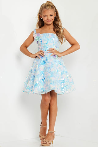 Experience the beauty of nature with the Jovani K23956 floral fit and flare short dress. This stunning dress is perfect for pageants and features intricate flower sequin detailing. Little girls will feel like a flower girl in this charming piece. Turn heads and make memories in this show-stopping dress.