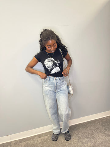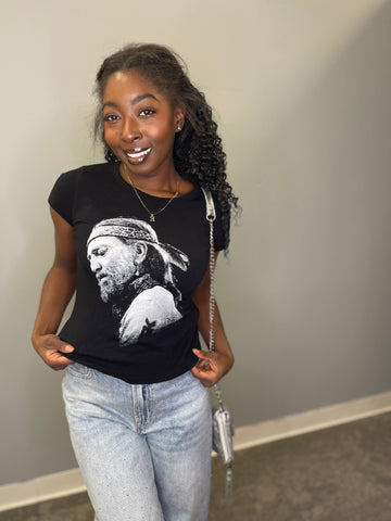 Keep it cool and collected in the “Just Breathe Baby” Tee by People of Leisure, featuring a bold, oversized portrait of country icon Willie Nelson. Printed on a soft, fitted black tee, this piece blends classic rock-and-roll roots with modern minimalist style. Ethically crafted with sustainability in mind, it offers a snug yet breathable fit, perfect for pairing with high-rise denim, layered jewelry, or a sleek crossbody bag. Whether you’re channeling rebel spirit or going for understated cool, this tee’s message is clear: take a breath, and wear it like you mean it.