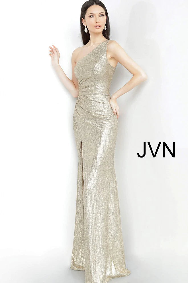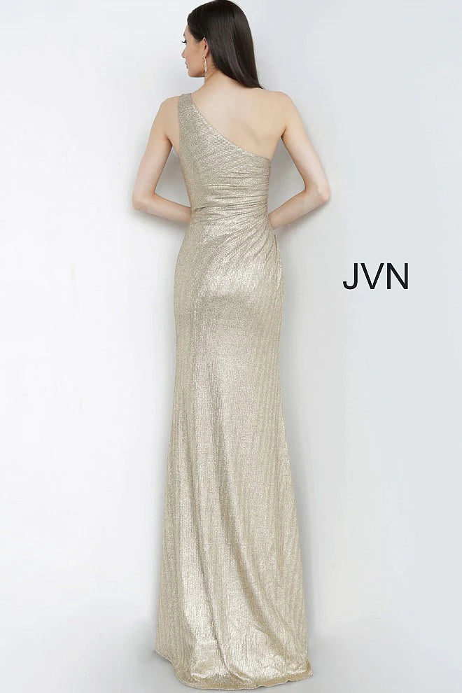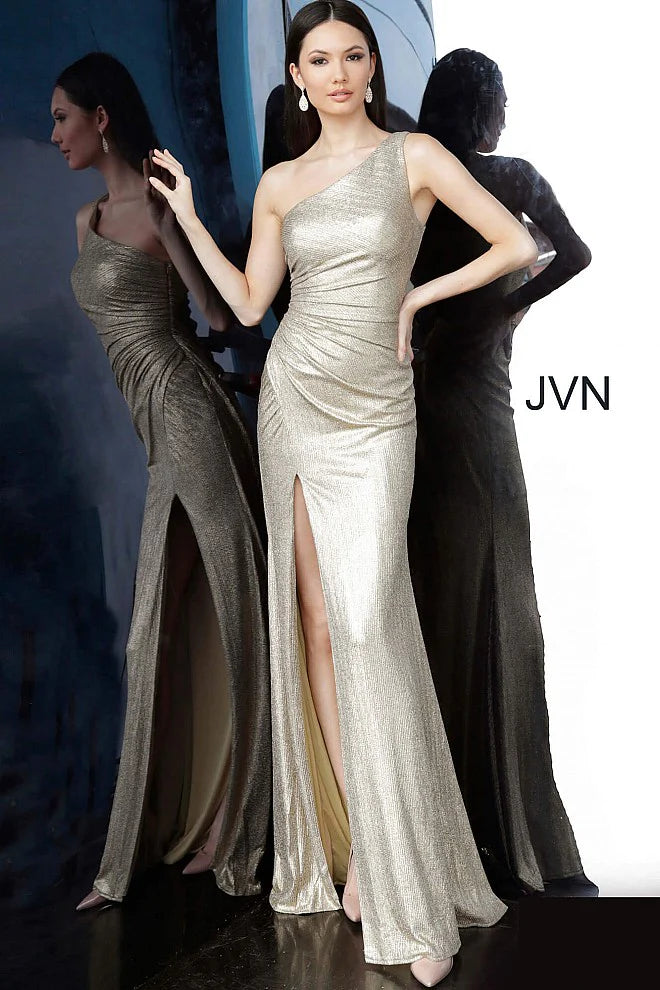 A perfect choice for a formal event, the JVN JVN4734 is an elegant one shoulder long dress. Crafted from metallic material, its unique rutch detailing at the waist provides an exclusive look and an alluring slit adds a touch of sophistication.