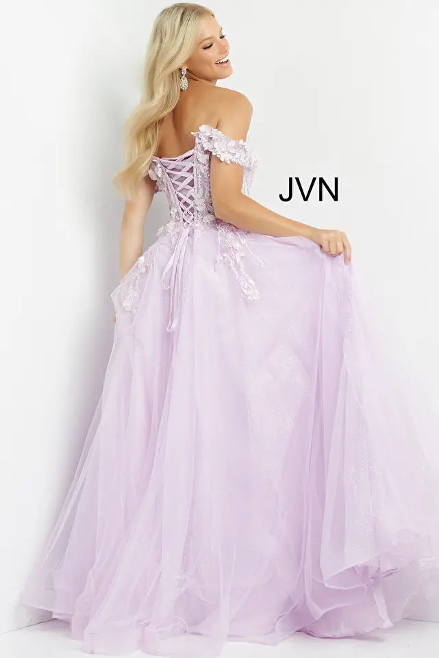 Be the belle of the ball in this spectacular JVN Jovani 08295. Its corset top and off-the-shoulder styling are embellished with antique-inspired floral sprays and shimmering sparkles, while its full tull skirt provides an elegantly romantic silhouette. The lace-up tie back adds a vintage touch to this luxurious ballgown, perfect for any prom night.