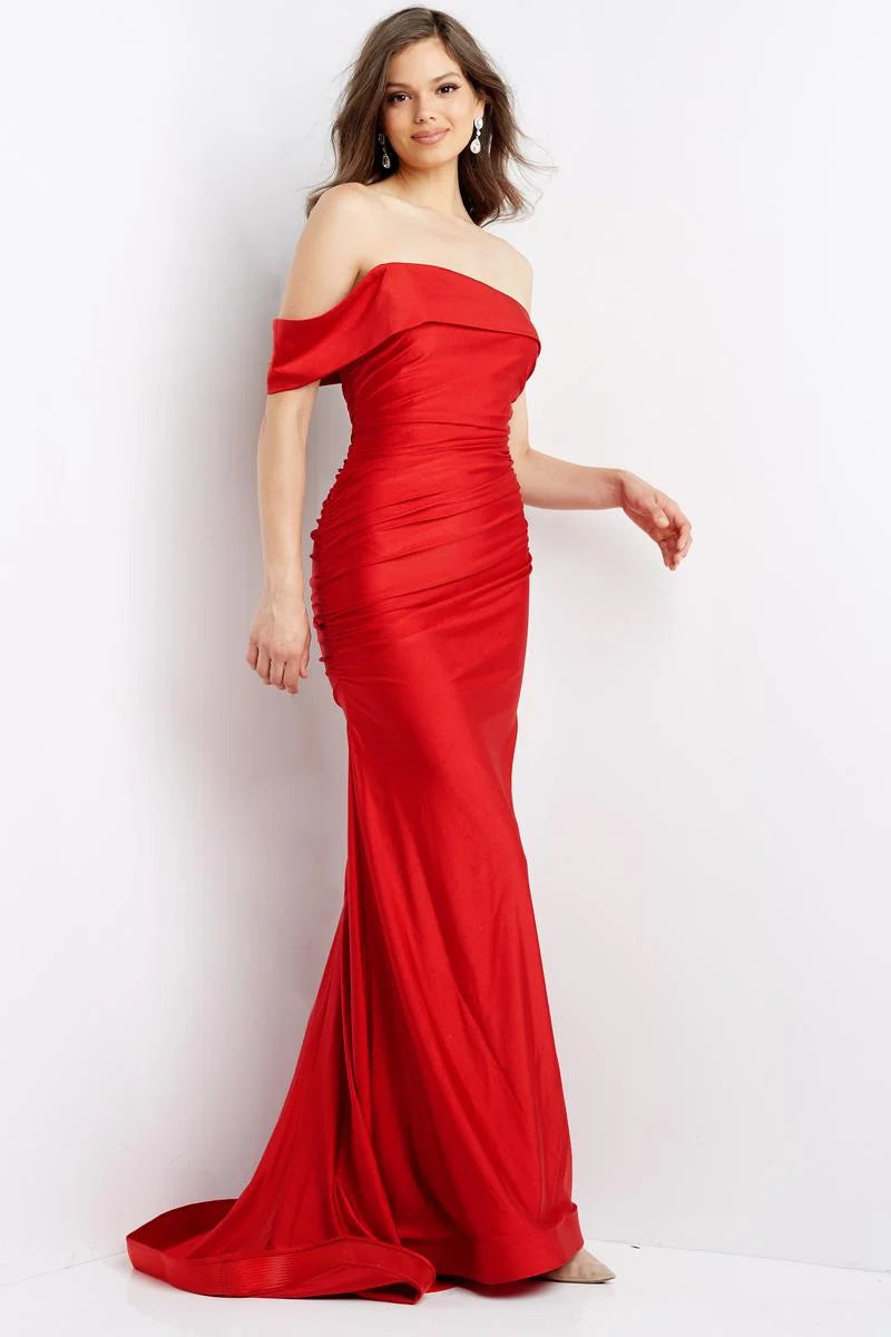 This Jovani JVN07640 is the perfect formal look for any special occasion! Featuring a long fit and flare silhouette and one-shoulder drape sleeve, this style also includes a beautiful train for an extra touch of elegance. Make a fashion statement while looking effortlessly chic.