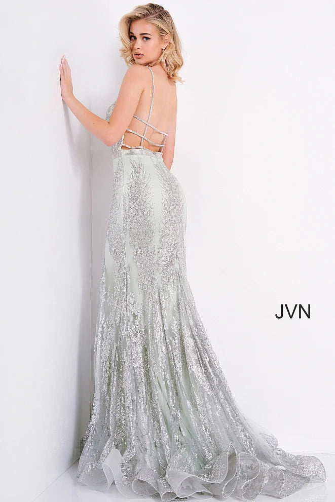 Introduce sophistication and glamour to your next special event with the JVN3663 long formal gown. Featuring a deep V-neckline, open back, and intricate rhinestone detailing and glitter embellishments, this gown will surely make a statement. The added train adds a luxurious touch.