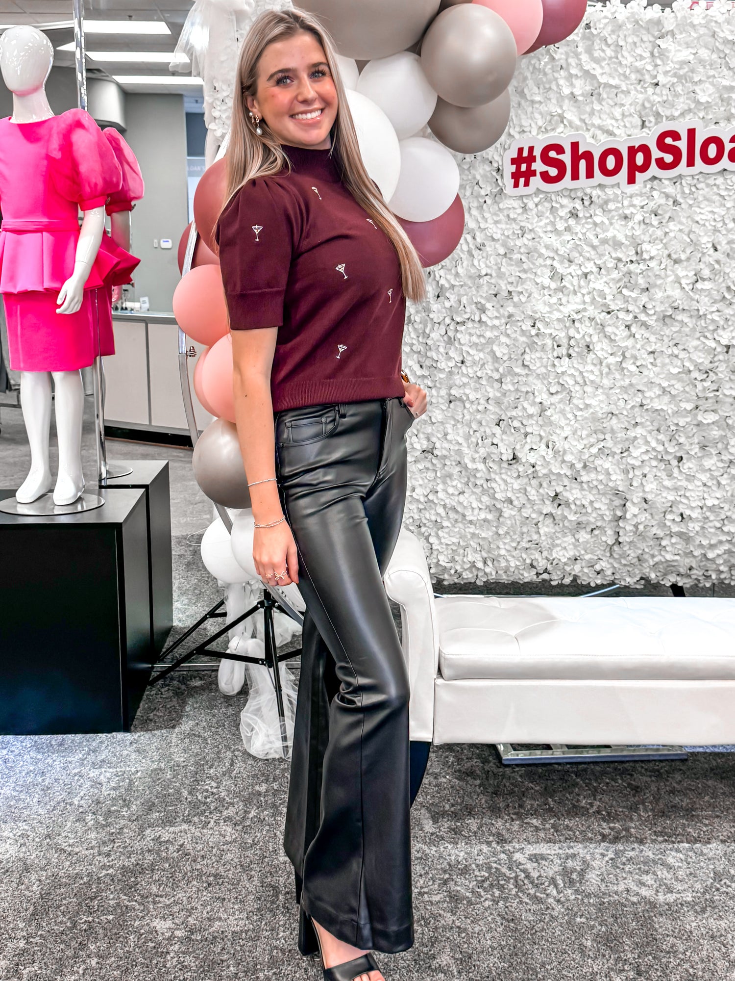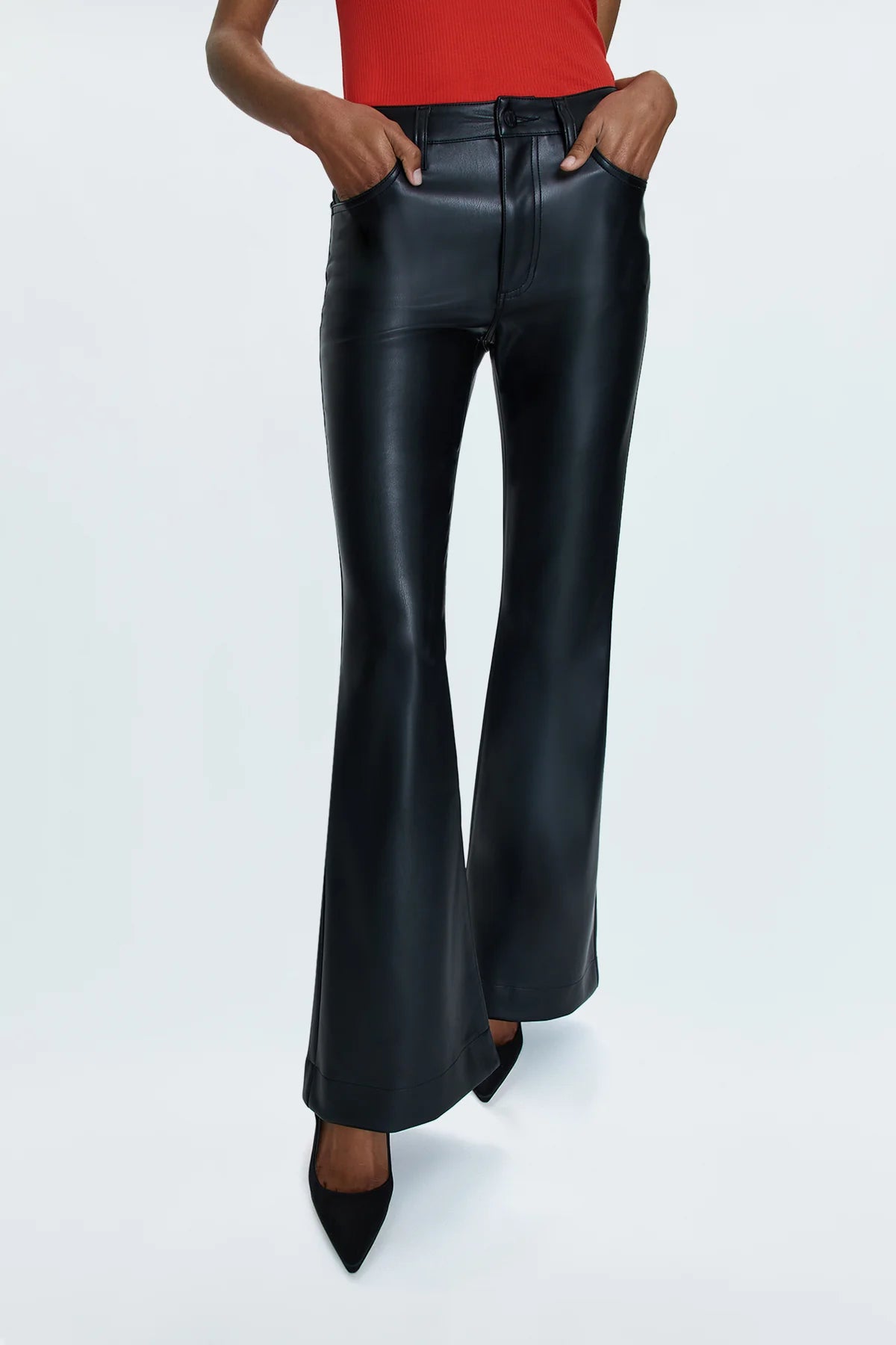 Turn heads with the Kinsley Mid Rise Ultra Flare pants! Made with high-quality black leather, these flare pants are the perfect statement piece for any outfit. Elevate your style and exude confidence with these must-have pants.