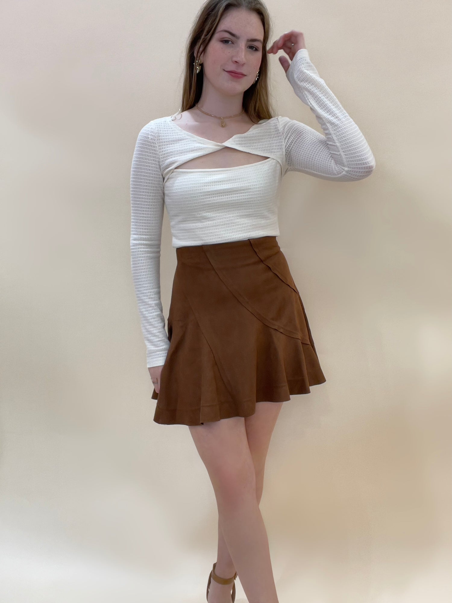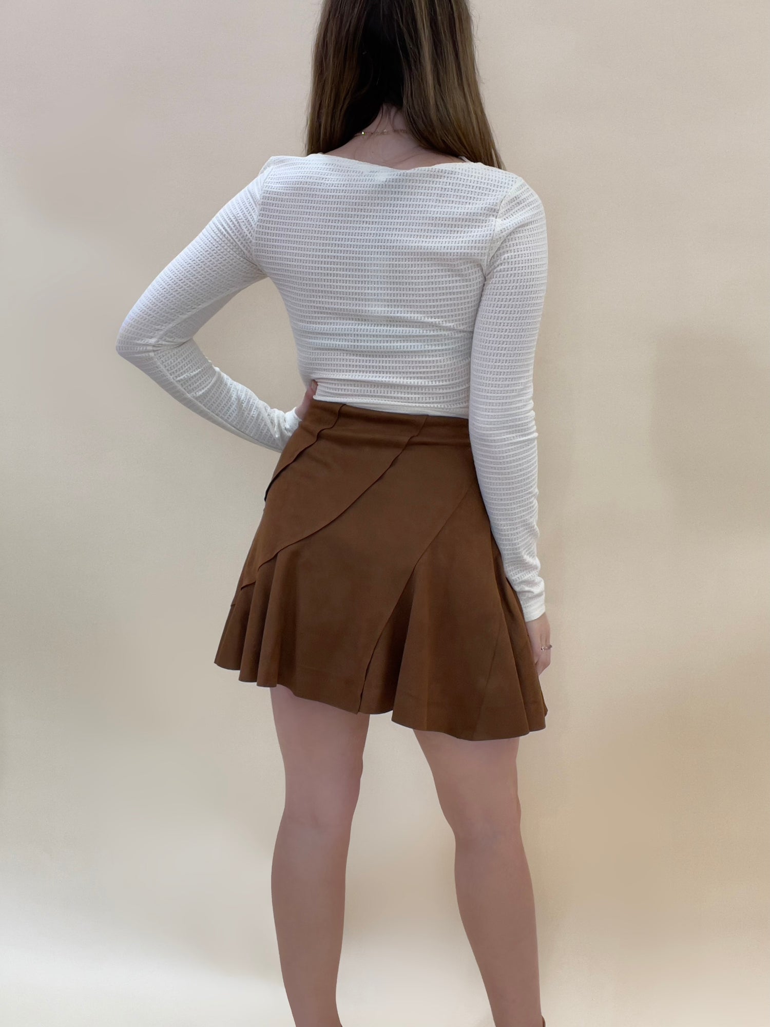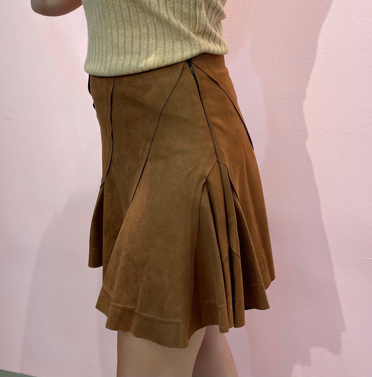 Crafted with majestic poise and graceful movement, the Lean On Me Paneled Mini Skirt is an elegant addition to any luxury wardrobe. The paneled design in brown is a timeless classic, sure to draw admiring glances wherever you go. Make a statement of sophisticated luxury.