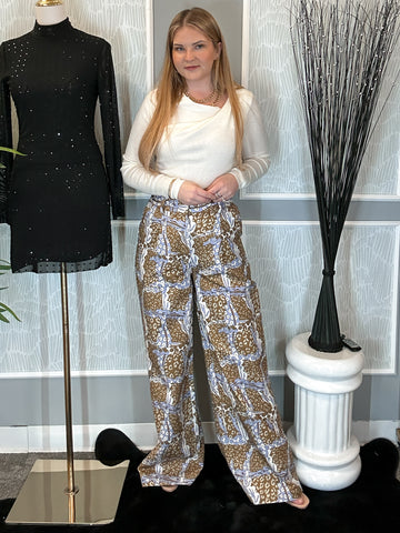 Make a bold, carefree statement in the Loki Pants, your new go-to for elevated ease. Featuring a vintage-inspired ochre leopard print with lilac and ivory accents, these wide-leg trousers bring effortless flow and artistic flair to any look.