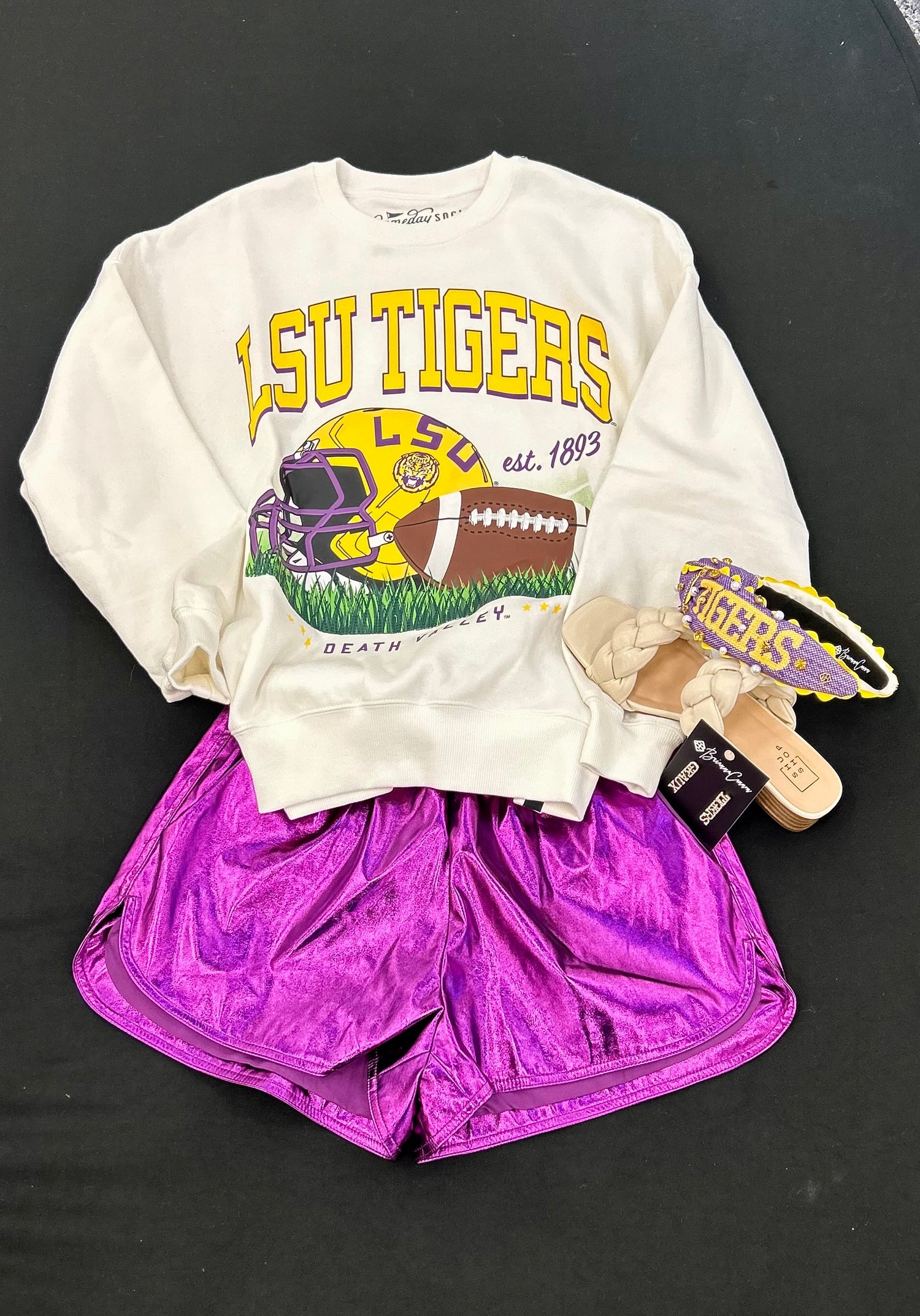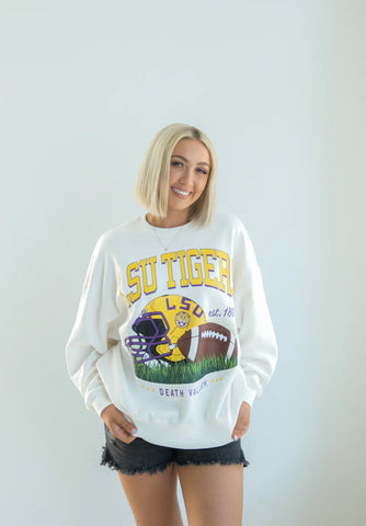 Experience the ultimate blend of comfort and style with our LSU Malone Multimedia OS Crew. The oversized fit provides room for movement and the trendy design is perfect for any occasion. With biker shorts and sneakers, you'll never want to take this crewneck off!