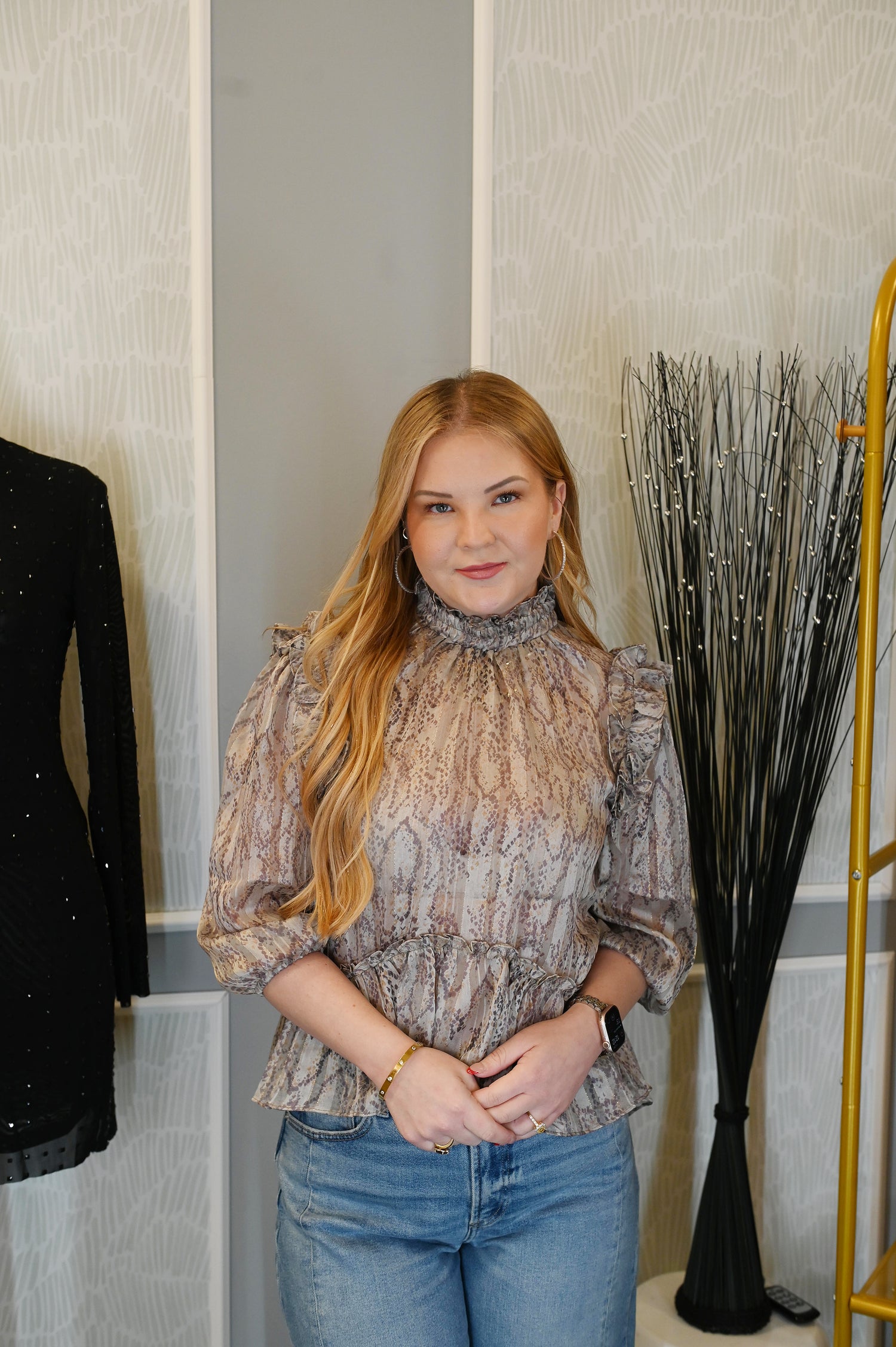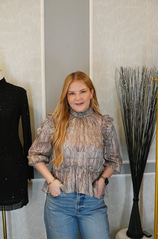 Unleash your wild side with the Mallory Top. This sheer blouse features a fierce snake print and long sleeves for a daring look. Perfect for any fashionista who wants to add a touch of edge to their wardrobe. (Warning: may induce spontaneous hissing.)