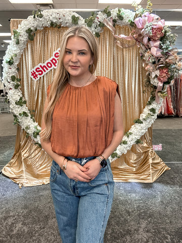 The Milana Top in Copper is a timeless piece that brings bold sophistication to any outfit. Its flowy pleated design makes it easy to pair with denim for a chic daytime look or style with tailored trousers and heels for an elegant evening vibe. A true wardrobe staple that combines versatility with modern glam.