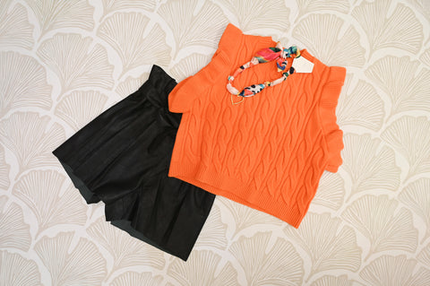 Make a statement with this vibrant sleeveless cable knit top in a striking orange hue. Featuring a textured, raised cable pattern throughout the front, this piece blends cozy knitwear charm with a modern, sleeveless silhouette. The high crew neckline and slightly cropped hem create a flattering, fashion-forward shape perfect for pairing with skirts, trousers, or layered over dresses. Crafted for both comfort and style, this top brings a pop of color and personality to any look — ideal for transitioning from casual daytime wear to chic evening outings.