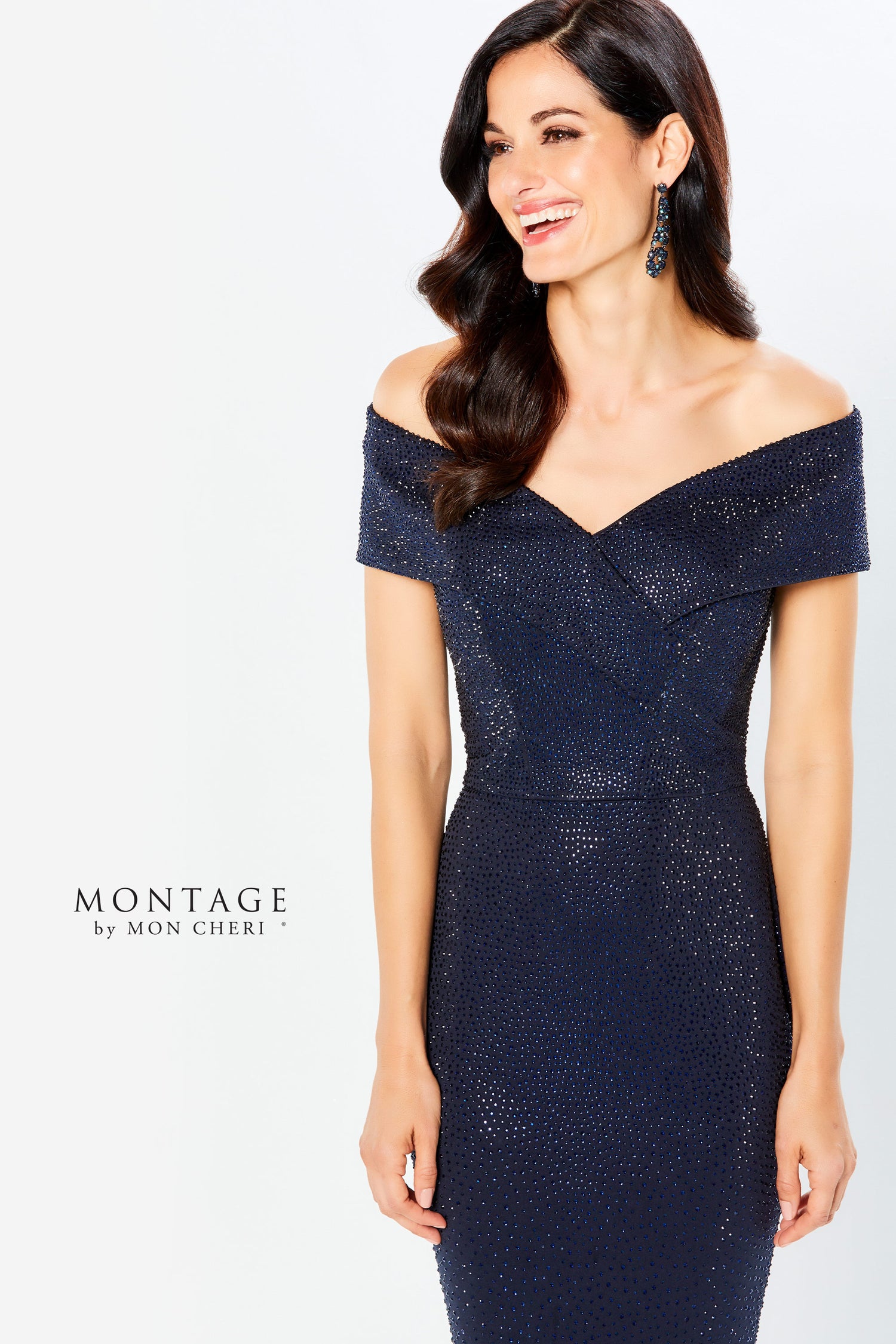 This beautiful gown by Montage 220949 is sure to make you look and feel like the belle of the ball! Featuring an off the shoulder design, rhinestone embellishments, and a flattering fit and flare silhouette, this elegant garment is sure to be the talk of the event.