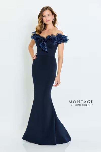 Elevate your special occasions with the Montage m538, a chic mermaid gown made from luxurious stretch crepe. Its flattering sweetheart neckline and elegant three-quarter sleeves exude both classic style and modern grace. Plus, it comes with a matching shawl for a seamless day to evening look. Indulge in luxury and versatility with this gown!