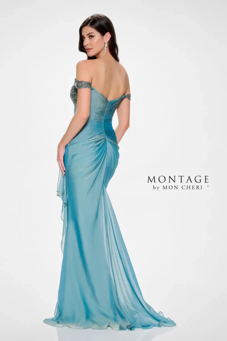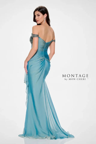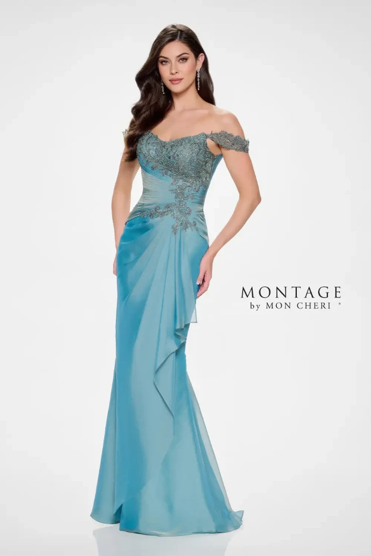 Celebrate your style with Montage M843. With an off-the-shoulder design and intricate lace appliques, this romantic mermaid gown adds a touch of classic sophistication. The ruched bodice cinches at the waist, flowing seamlessly into a draped skirt. Whether you choose the detachable off-the-shoulder straps or delicate spaghetti straps, this gown will make you feel fabulous!