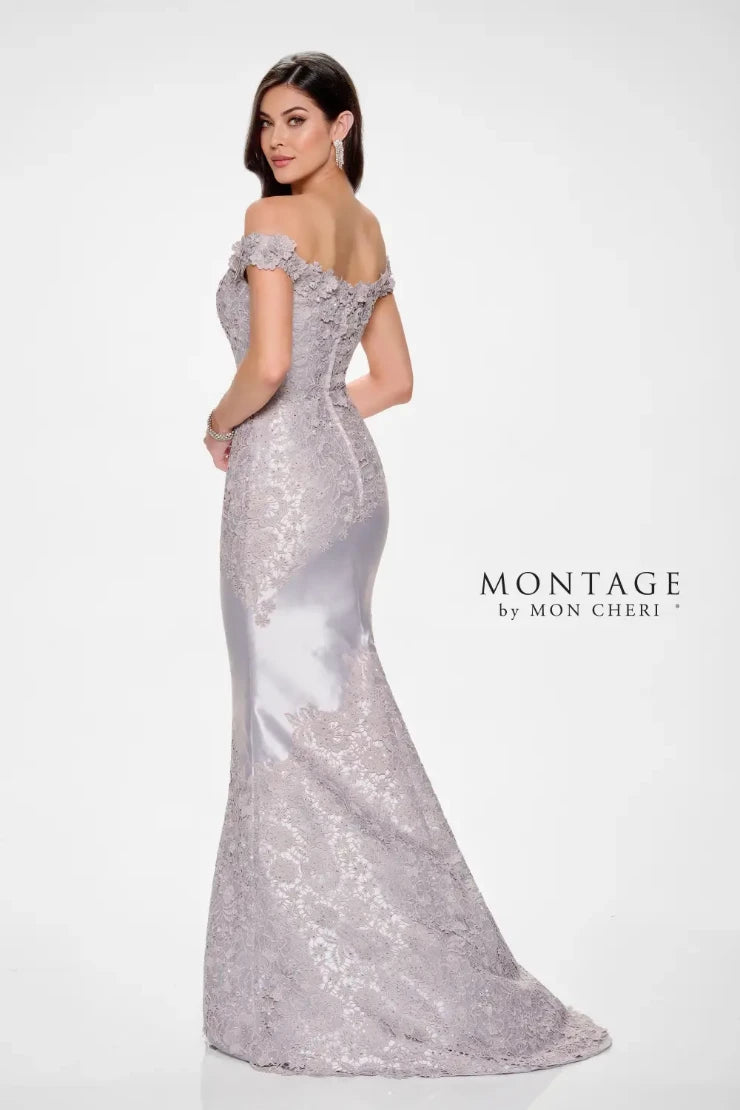 Unleash your inner elegance with the Montage M846 gown. Made from luxurious Mikado fabric, this off-the-shoulder style is adorned with delicate floral lace appliqués that enhance your silhouette. The fitted bodice flawlessly transitions into a flared mermaid skirt, making you both flattering and dramatic. Timeless and captivating!