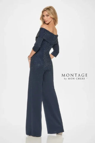 Elevate your style with the Montage M850! This elegant jumpsuit features stone accents and a v-neckline, perfect for any special occasion. Made from stretch crepe, it offers a flattering natural waistline and comes with separate three-quarter sleeves for added versatility. Make a statement in this unique and sophisticated design.