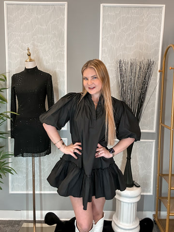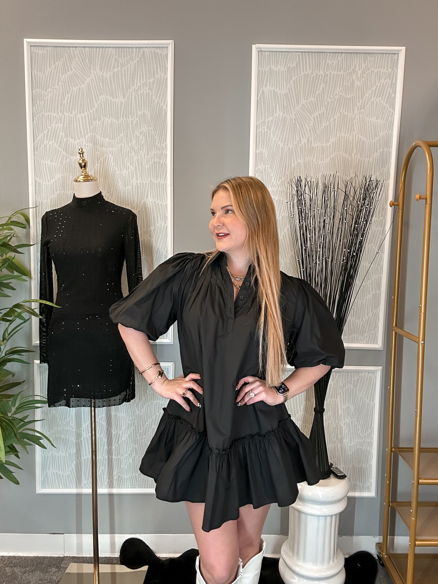 Chic and effortless, this black poplin mini dress combines classic style with playful details. Featuring short puff sleeves, a partial button-front placket, and a textured collar accent, it delivers a polished yet relaxed look. The loose, comfortable silhouette is finished with a flouncy ruffle hem for a touch of feminine movement. Perfect for day-to-night wear, this versatile dress pairs beautifully with strappy heels for an elevated look or sneakers for a casual vibe. Crafted from lightweight poplin, it’s an easy choice for warm-weather outings and year-round layering.
