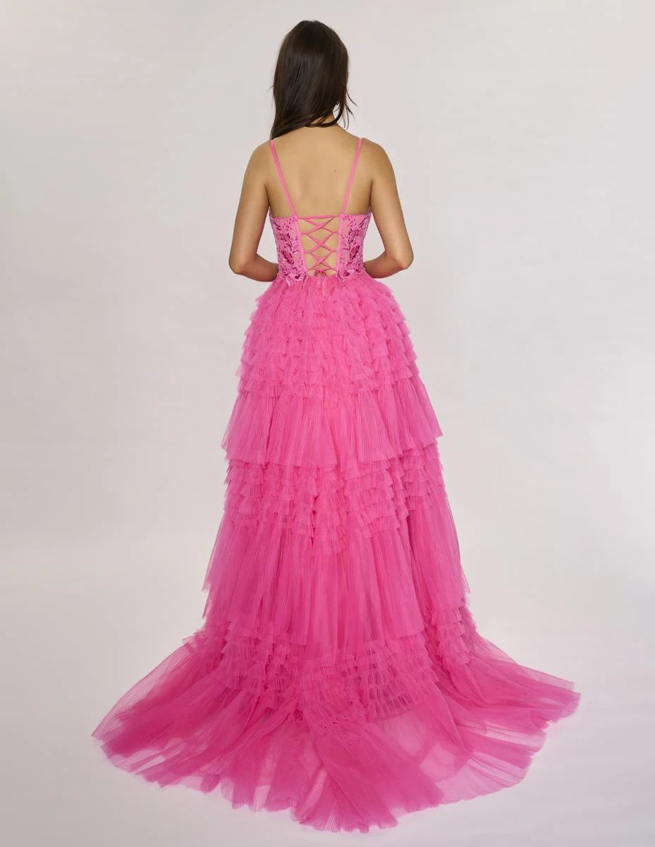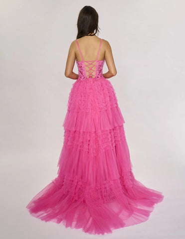 Introducing the Nina Canacci 1582 - the perfect blend of elegance and playfulness. This stunning long formal gown features a sheer bodice and a flattering a-line silhouette, topped off with a small train and a tulle skirt. Perfect for any special occasion, this dress will make you stand out from the crowd.