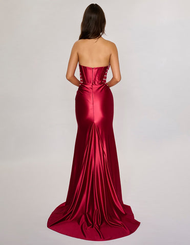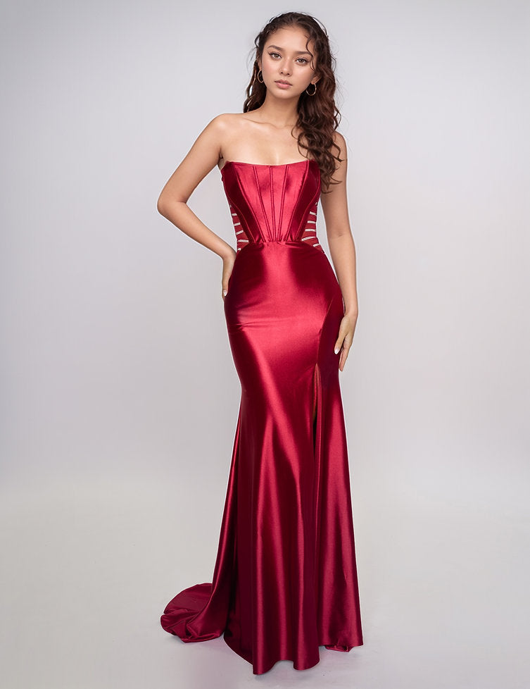 Elevate your formal look with the Nina Canacci 5307 dress. Its strapless design and corset bodice provide a flattering fit, while the side cut outs with rhinestone detailing add a touch of sparkle. With its long length and slit for ease of movement, you'll be the star of any event.
