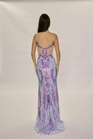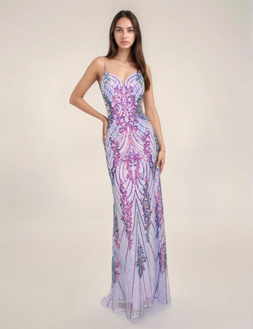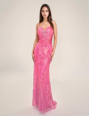 Get ready to turn heads and steal the show in the Nina Canacci 7609. This stunning long formal gown is adorned with an all over sequin pattern, making you sparkle and shine wherever you go. The sheer back and sides add a touch of allure, while the sweetheart neckline and delicate spaghetti straps bring a feminine and elegant feel. Make a statement with this glamorous dress.