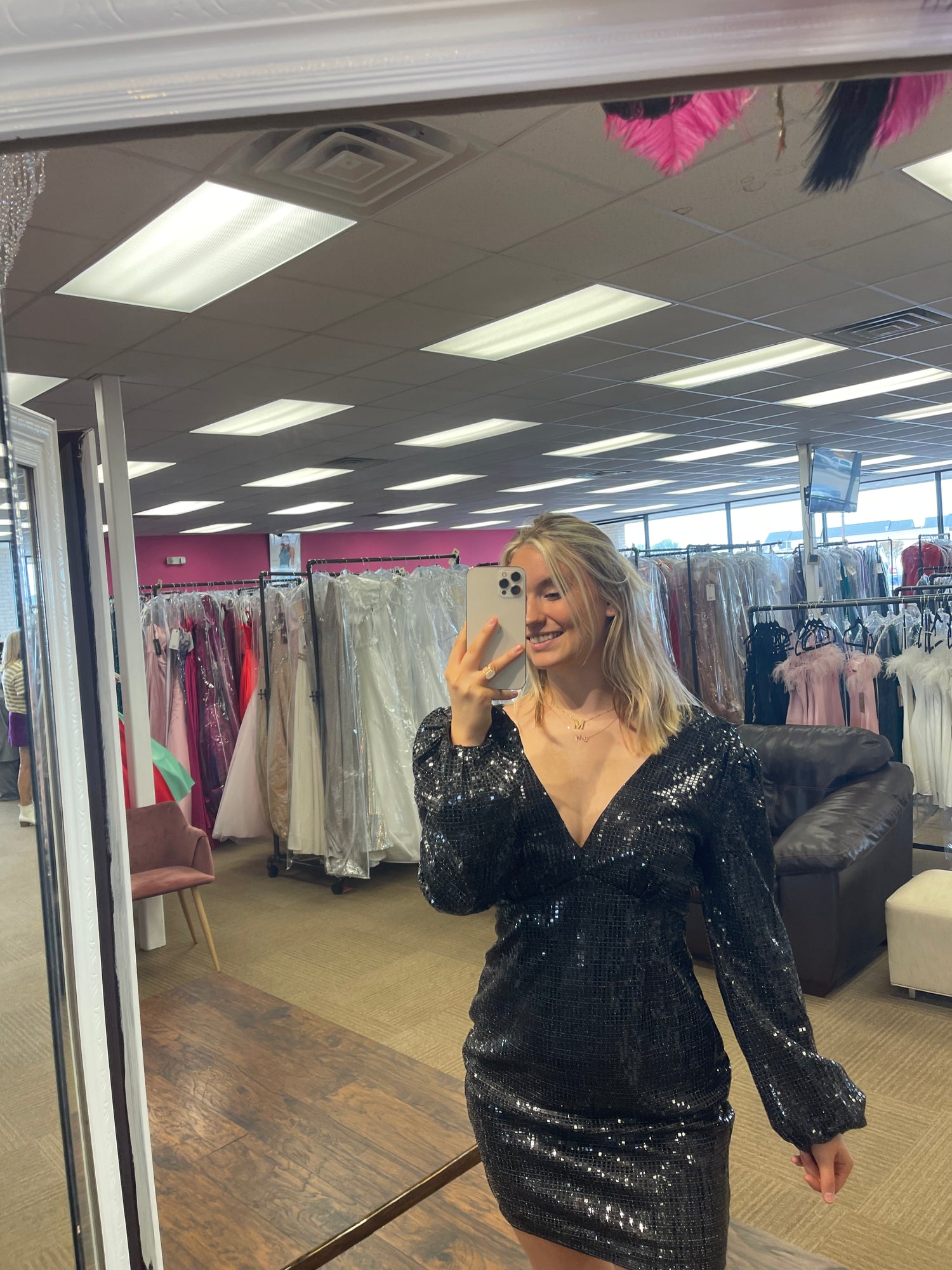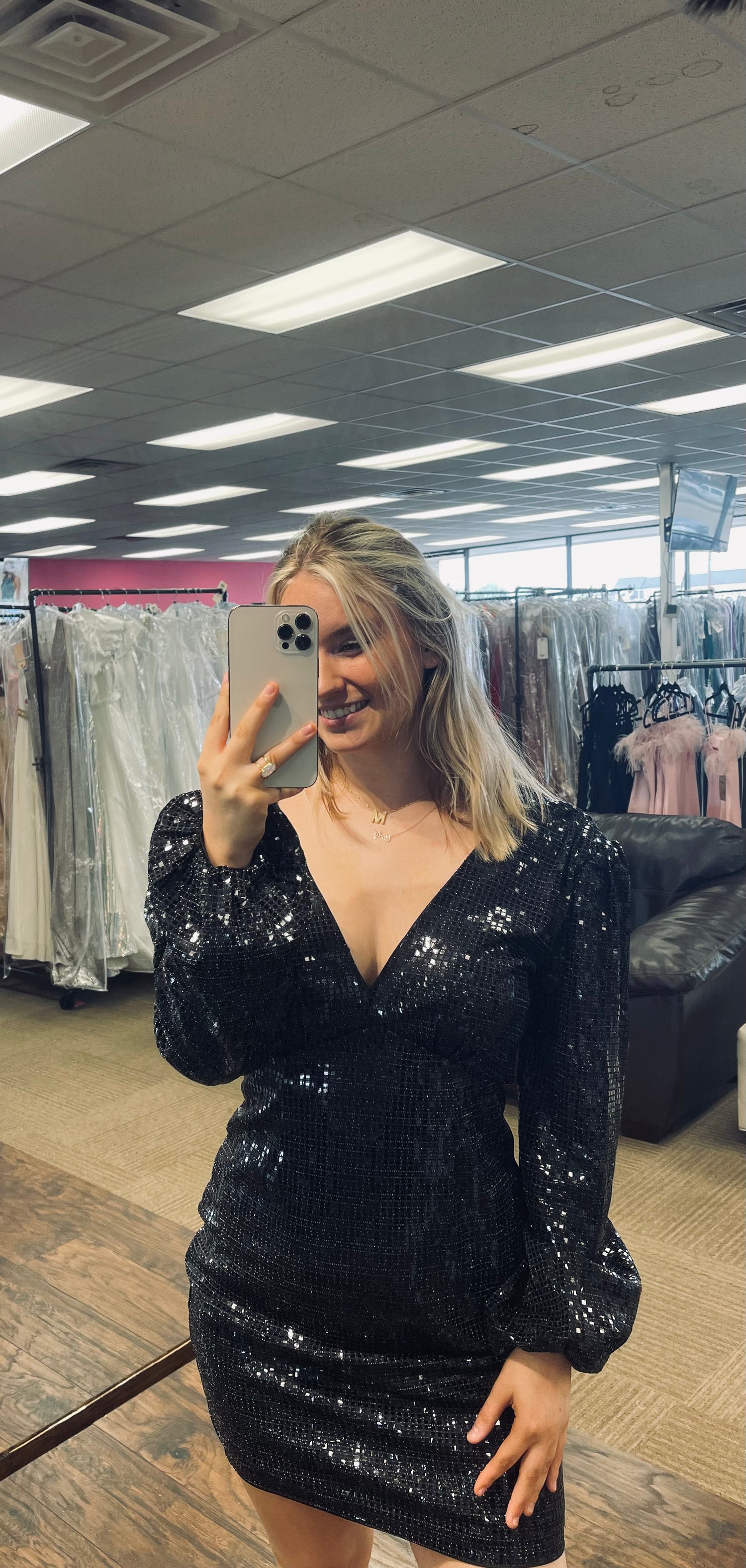 This sequin dress is the perfect combination of flattering and fun. The open neck makes it easy to wear with your favorite jewelry, while the puffy sleeves add some unexpected drama.