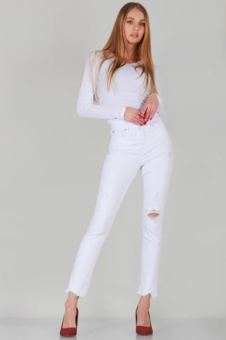 Gracie Jean are high-quality, white denim jeans with classic frayed ends, and stylish rip detailing. Stretchy fabric ensures a comfortable fit with all-day wearability. Perfect for completing any casual or street fashion look.