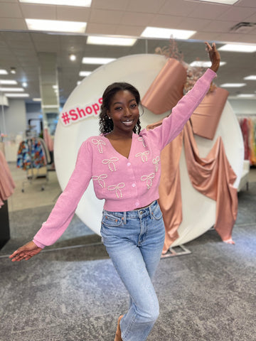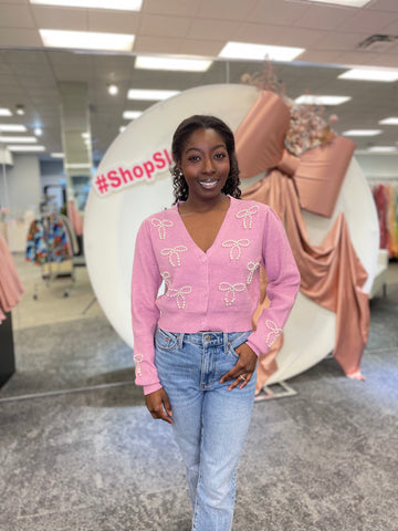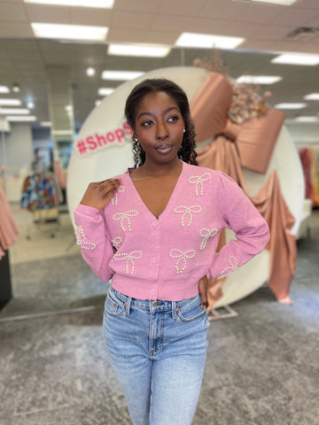 Add a touch of fun with our Peach Love Pearl Bow Cardigan! Perfect for the office or a night out, this cardigan adds a playful twist with its bows. Dress it up for a dinner party or wear it for a girls night out. Versatile and stylish, this cardigan is a must-have!