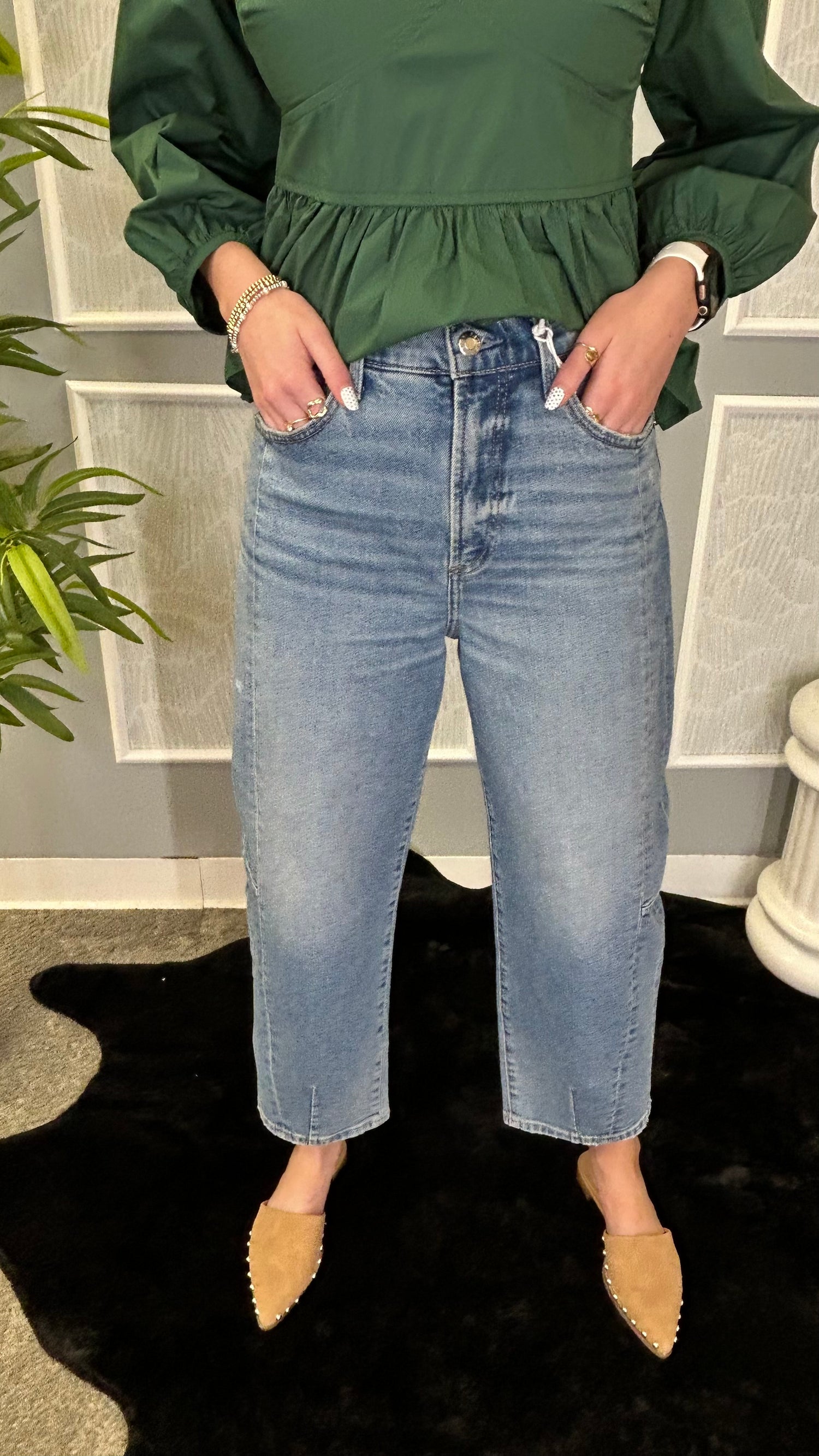 - An arresting, modern silhouette designed with a barrel bowed leg and a relaxed silhouette. Crafted from our wear-everywhere comfort stretch denim. Rhythm Vintage is a classic medium blue denim wash with moderate fading and whiskering and clean finishes.