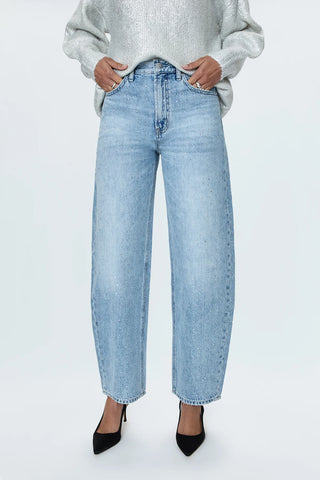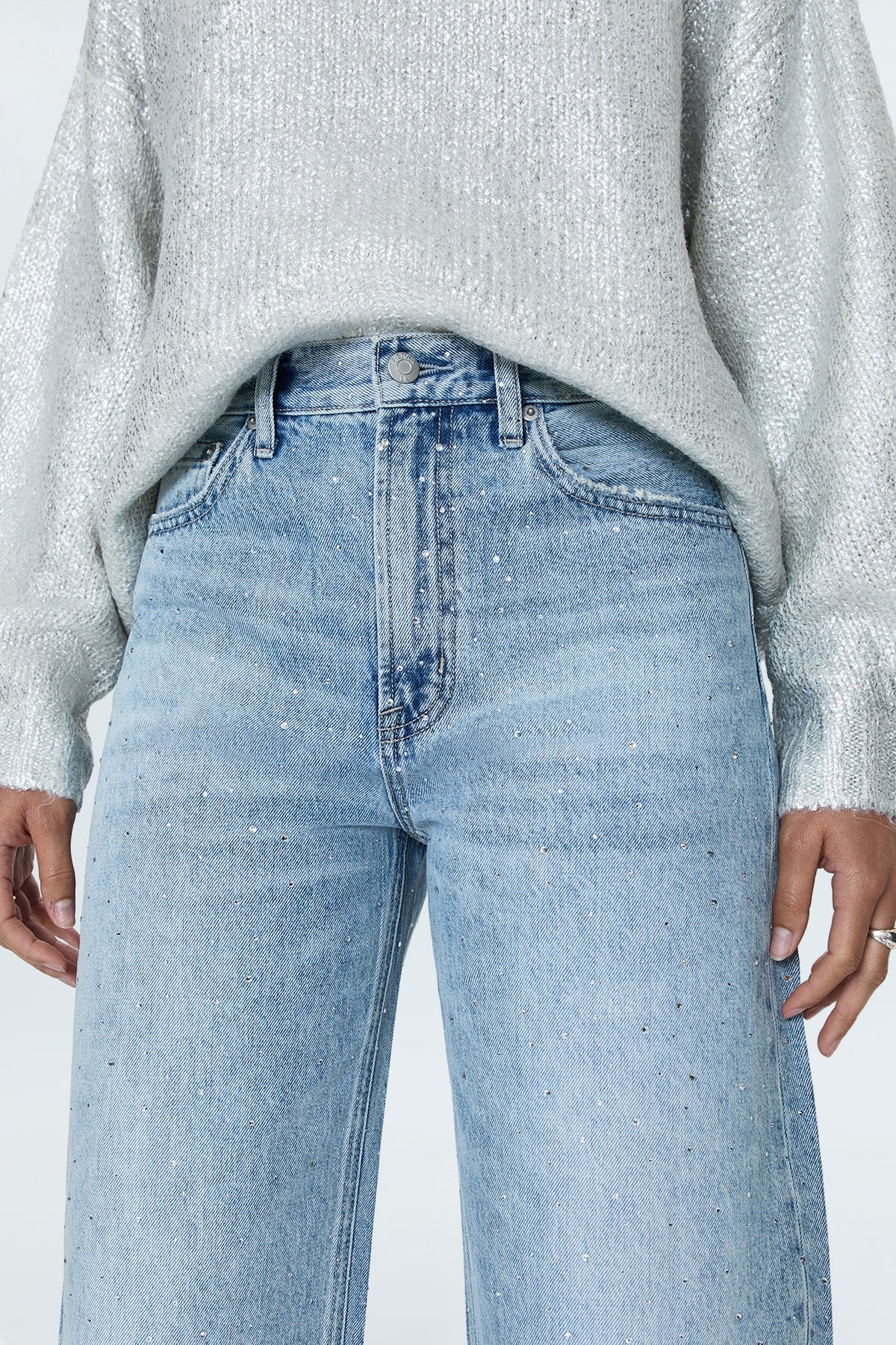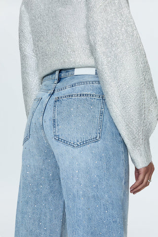 High rise waist with a full length 30" inseam and a barrel leg silhouette. Crafted from rigid non-stretch denim for an expert fit that holds its shape, with clean hem finishes. Glitz is a light wash indigo denim adorned with micro crystal embellishments throughout for an eye-catching aesthetic.