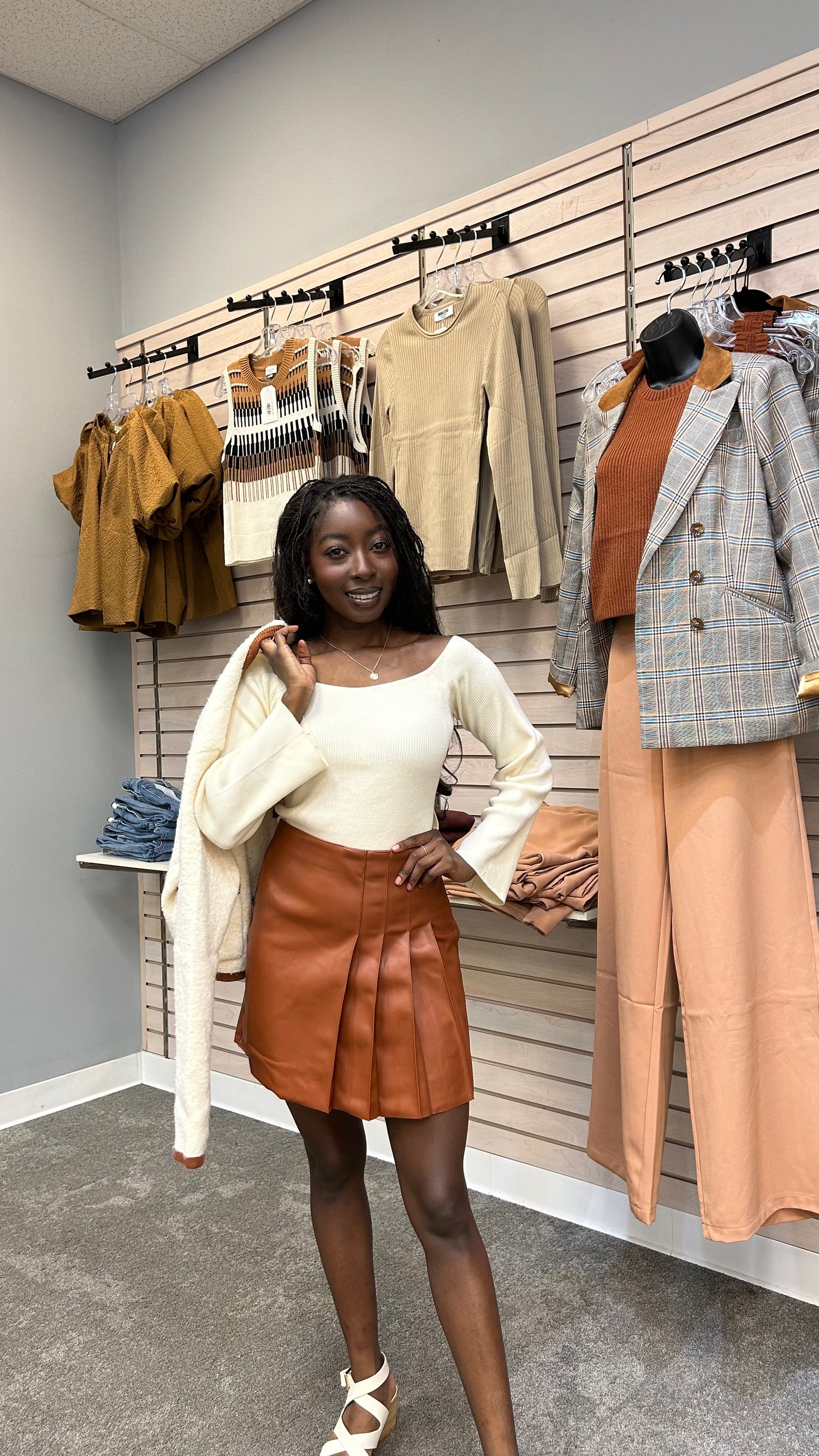 Get ready to turn heads in the Christina Pleated Skirt! Made with faux leather, this pleated skirt adds a touch of edgy elegance to any outfit. The unique design and material make it both stylish and comfortable, making it a must-have for your wardrobe.