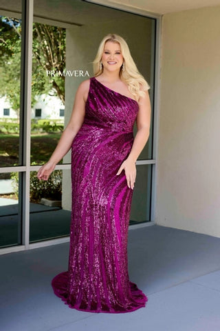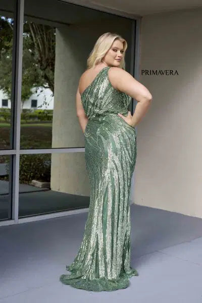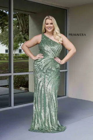 Get ready to turn heads at Prom 2025 with the Primavera Curvy Dress 14075! With its fitted one-shoulder design and cascading sequins, this gown will make you stand out and shine with every step. The shimmering sequins add a touch of glamour, making you the star of the night.