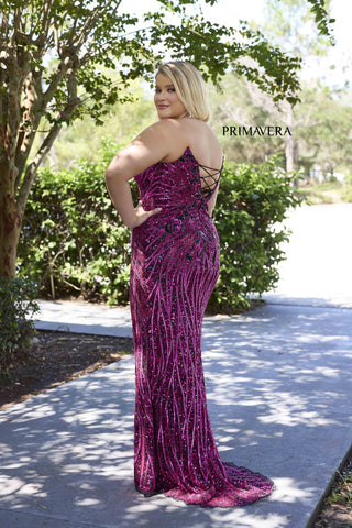 Dramatic, dazzling, and designed to celebrate curves, Primavera 14083 is a true statement gown. This stunning fuchsia and black evening dress features a plunging sweetheart neckline adorned with intricate beading arranged in radiant, figure-enhancing patterns that sparkle with every step.