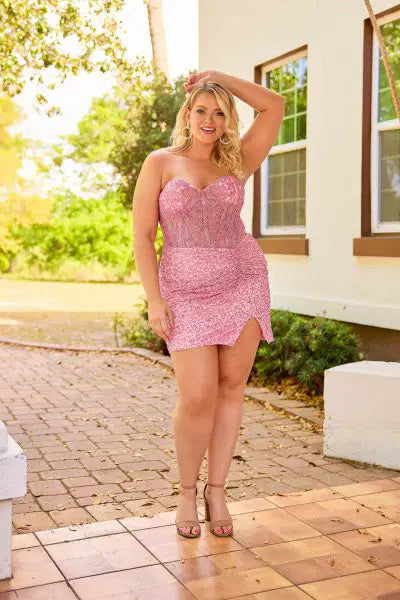 Turn every head in Primavera 14098, a stunning strapless mini designed to flatter and shine. The structured corset bodice features intricate sequin embellishments that highlight your curves, while the sweetheart neckline adds a romantic, feminine touch.