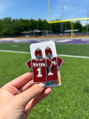 Looking to add some team spirit to your look? These Red and White Jersey Earrings help you show off your fandom with four red gemstone studs, plus a cute red and white beaded jersey that reads "Win 1". Perfect for cheering on your squad with style and flair!