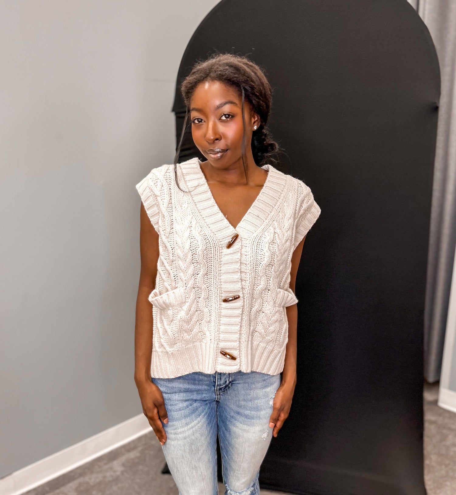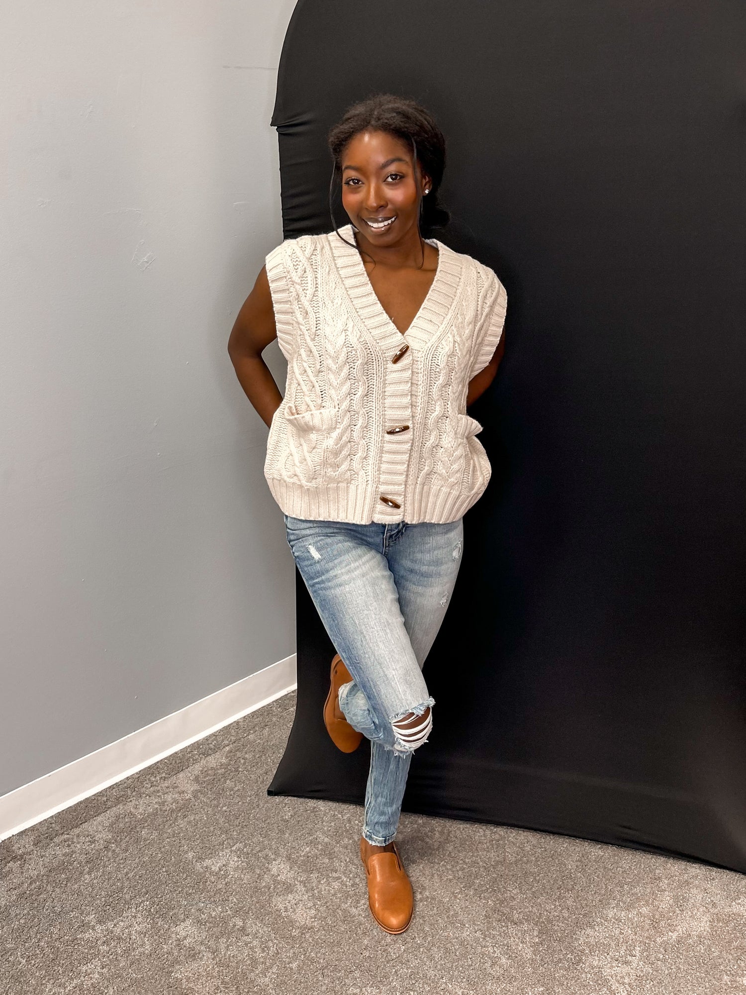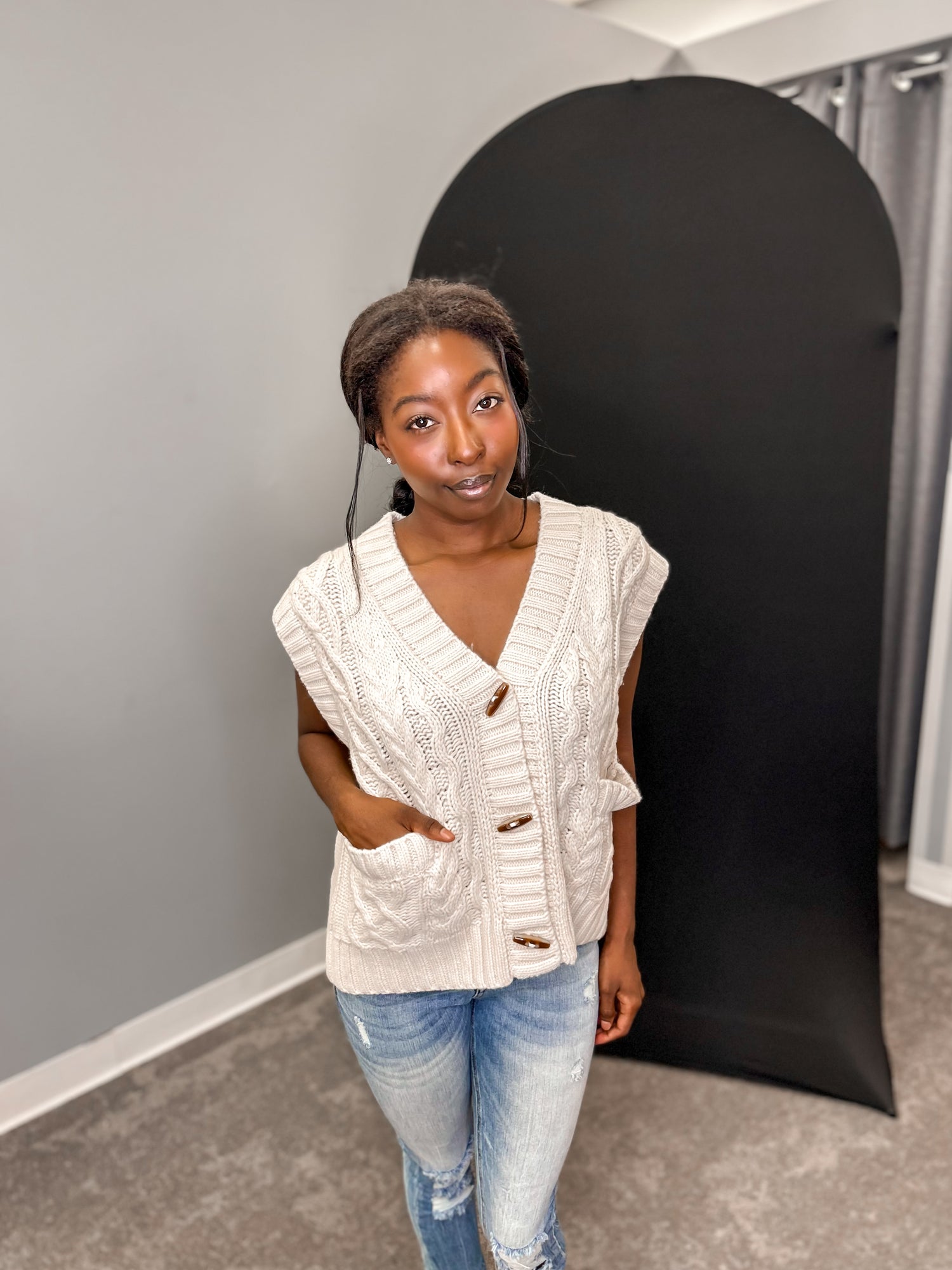 Stay stylish and cozy all winter long with our Sandy Sweater Vest. Featuring a V-neck design and toggle button closure, this vest is both functional and fashionable. The front pockets add convenience while adding an extra touch of flair. Keep warm while making a statement with this quirky and playful addition to your wardrobe.