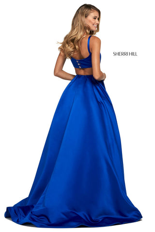 Mikado A-line with bateau neckline, cut out back, and embellished buttons.
