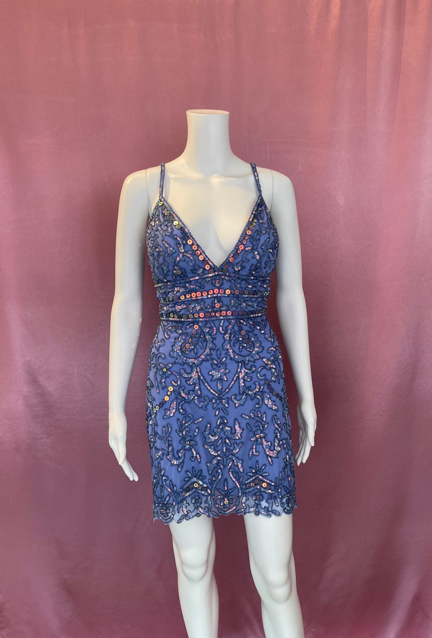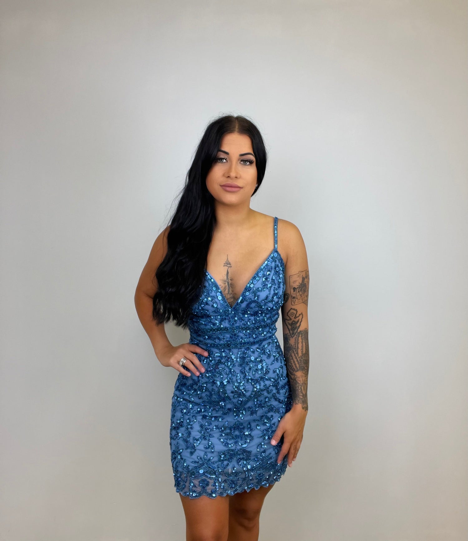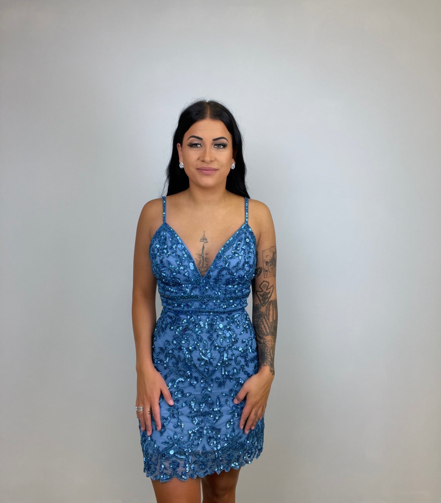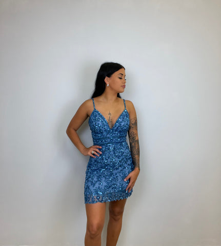 This dress is embellished with a lace pattern of beads and sequins in a full mini-length fitted silhouette showcasing a sleeveless V neckline, embellished spaghetti straps, and nipped midriff. The back flaunts an open style with lace-up support and a dangling tassel. Be ready to fascinate everyone in this short glam party dress style from Sherri Hill..