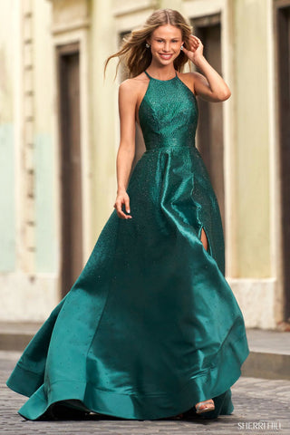 Get your sparkle on with the Sherri Hill 54422 ball gown! This stunning dress features a high neckline and a rhinestone-embellished bodice that'll catch everyone's eye. The mikado fabric adds a touch of elegance and the high skirt slit is perfect for showing off your killer heels. Make a statement at your next formal event with this unique dress!