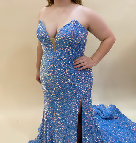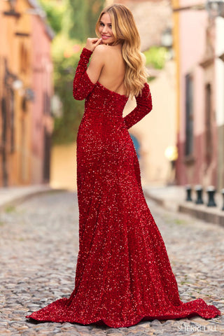 Sherri Hill 55377 is an elegant strapless formal dress with fully sequined fabric, making it a stunning choice for your next event. The detachable sleeves provide the flexibility to switch up your look throughout the night.