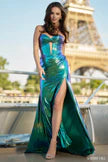 Make a statement in this Sherri Hill 56966 metallic gown. The corset bodice and keyhole add a touch of edginess to this strapless, emerald dress. A skirt slit completes the bold look. (Slay the night in style!)