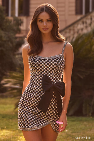 The fitted beaded mini silhouette is covered in sparkling pearl and crystal embellishments that catch the light beautifully. A bold black satin bow accent at the waist adds a statement-making touch, while the square neckline with delicate straps keeps the look sleek and feminine. Designed for fashion-forward elegance, this Sherri Hill party dress guarantees a head-turning entrance.