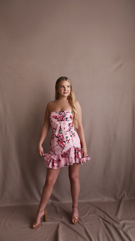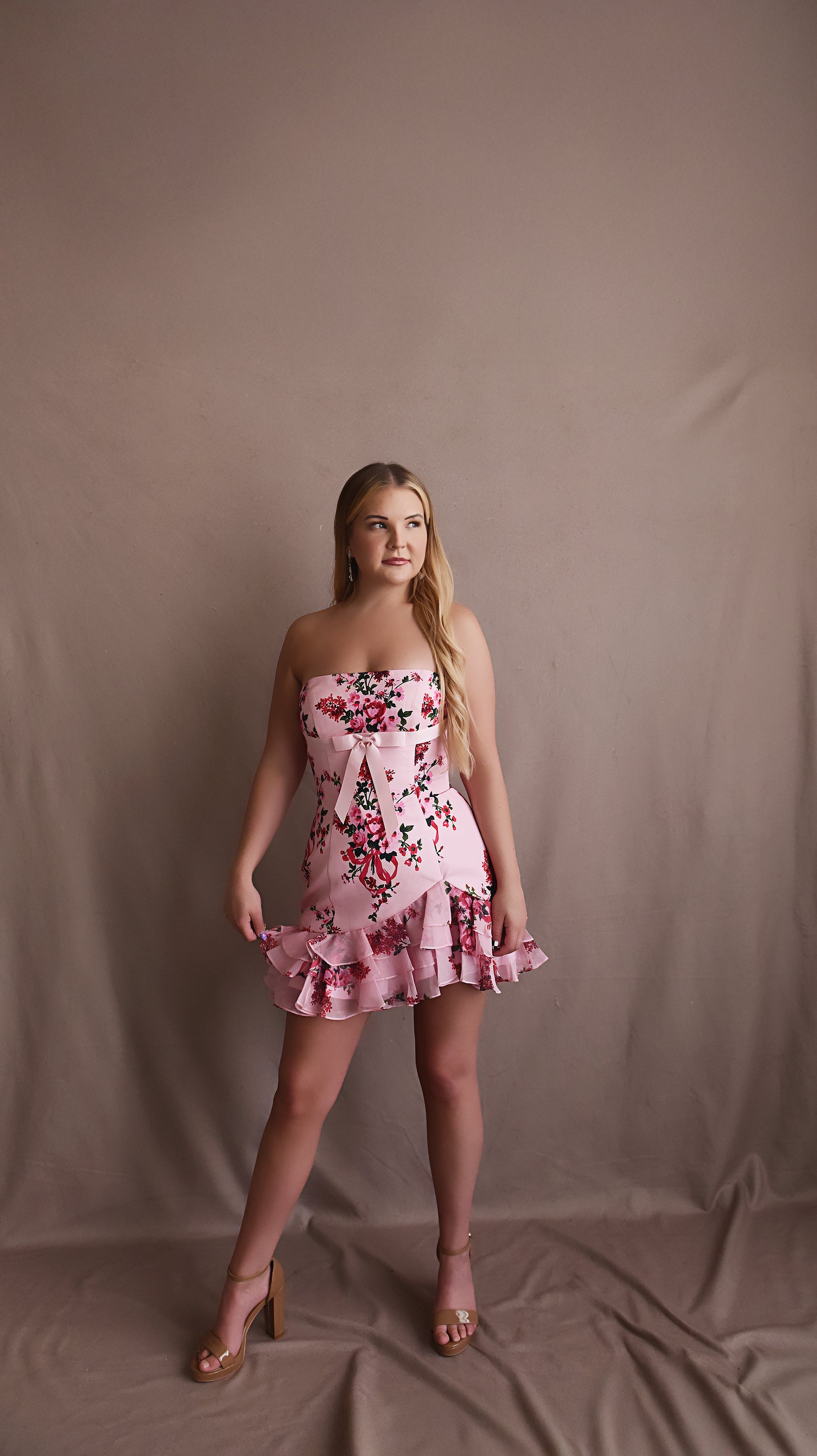 Turn heads in this romantic Sherri Hill floral mini dress – the perfect blend of sweetness and sophistication. Designed with a flattering corset-style bodice, this dress features delicate spaghetti straps and a sweetheart neckline that enhances your silhouette. The soft pink fabric is adorned with vibrant floral prints, giving it a fresh, feminine feel. Finished with a flirty layered ruffle hem, this look is perfect for spring formals, garden parties, homecoming, or any special occasion where you want to shine.
