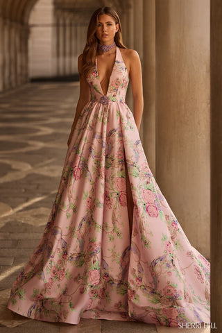 Make a stunning entrance in this Sherri Hill 57600 ballgown, designed to turn heads at any formal occasion. The dramatic deep V neckline paired with a secure halter top creates an elegant silhouette that flatters while providing confident support. Intricate floral print detailing adds romantic sophistication to the voluminous skirt, while a sparkling rhinestone choker elevates your look with glamorous finishing touches. Perfect for proms, galas, and black-tie events, this show-stopping gown combines timeless elegance with modern flair. You'll feel absolutely radiant in this unforgettable dress.