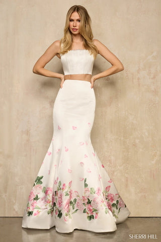 Elevate your formal look with this stunning two-piece dress from Sherri Hill. The fitted bodice features an elegant square neckline adorned with delicate pearl detailing that catches the light beautifully. The mermaid skirt showcases a gorgeous floral print that adds movement and dimension to your silhouette. Perfect for proms, galas, or special occasions, this dress combines sophisticated design with eye-catching details that ensure you'll turn heads. The flattering mermaid cut hugs your curves while the pearl-lined neckline frames your face with timeless elegance.